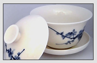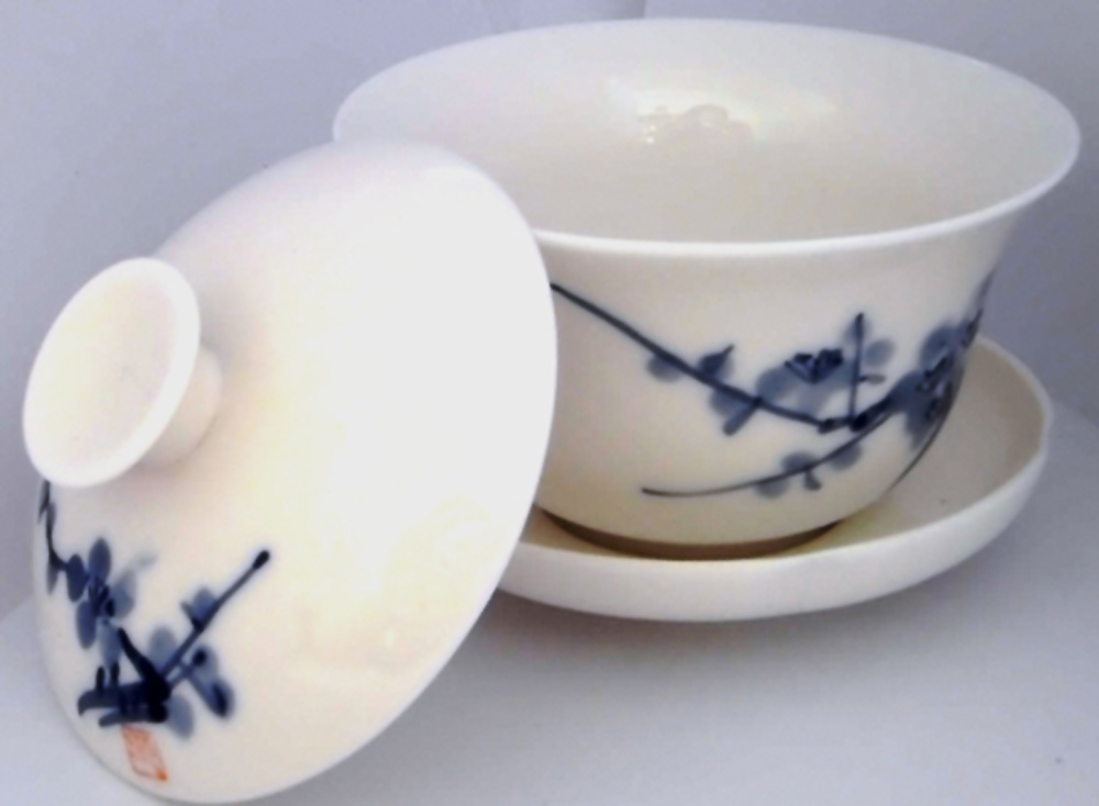 Die traditionelle chinesische Teetasse besteht aus drei Teilen: ein Deckel, eine Tasse und eine Untertasse. Diese Teetasse wird auch als Tasse der Dreiheiten bezeichnet. Die drei Teile symbolisieren jeweils den Himmel, den Menschen und die Erde - beim Teetrinken wünscht man sich eine Vereinigung mit dem Himmel und der Erde zu erreichen. Man kann diese Teetasse auch als Teekännchen benutzen.